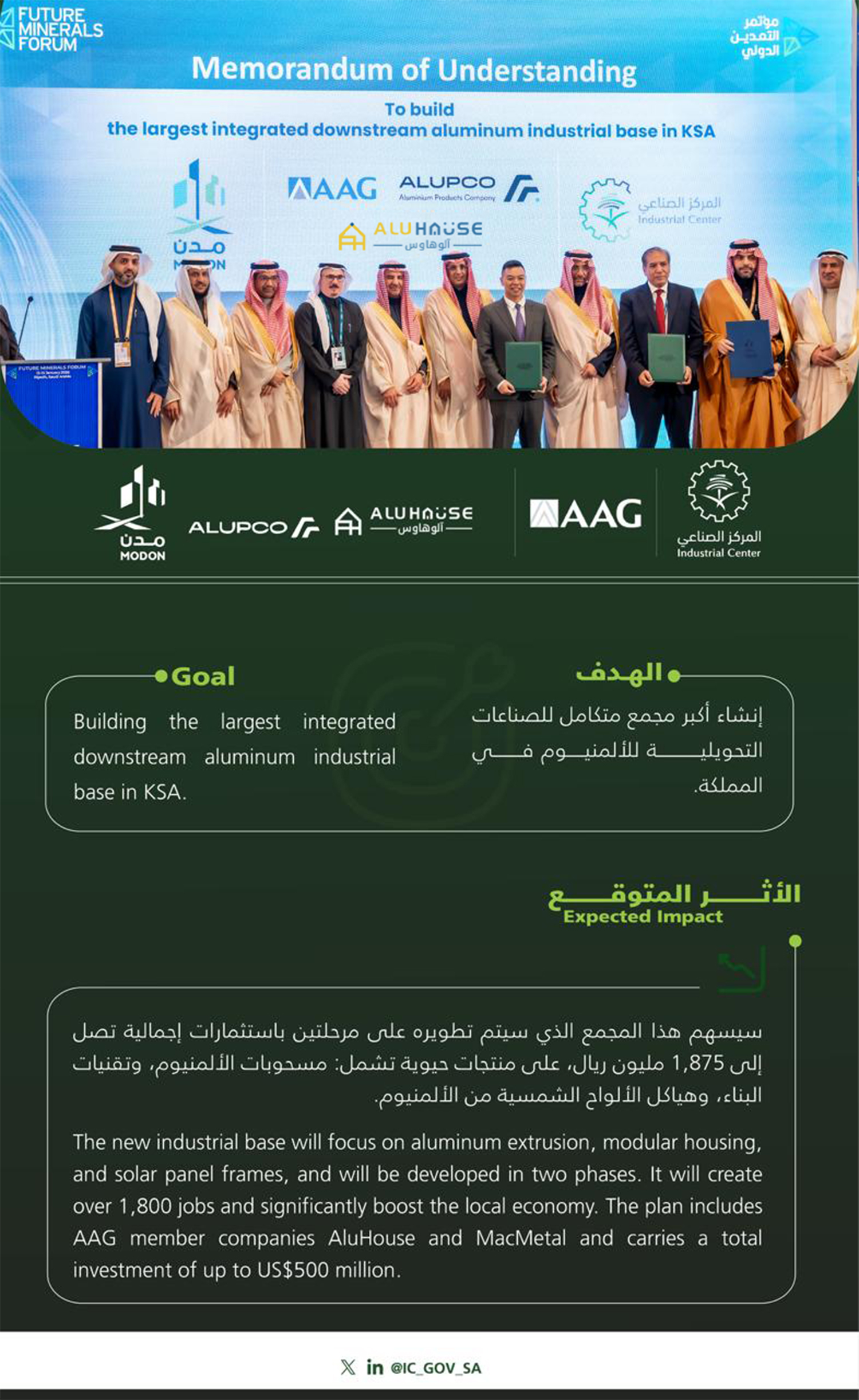 1月15日,在沙特.利雅得舉辦的2026年未來礦業大會(The Future Minerals Forum)期間,在沙特工業和礦產資源部(MIM)和沙特國家工業發展中心(NIDC)高層領導的共同見證下,AluHouse鋁遊家、ALUPCO與沙特工業城市和技術區管理局(MODON)舉行MOU合作諒解備忘錄簽約儀式。